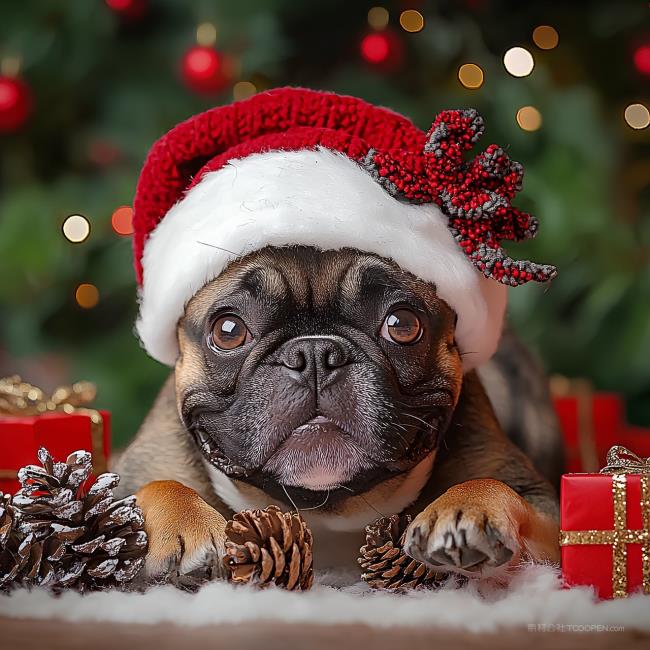 法国斗牛犬狗戴滑稽的圣诞帽 (2)