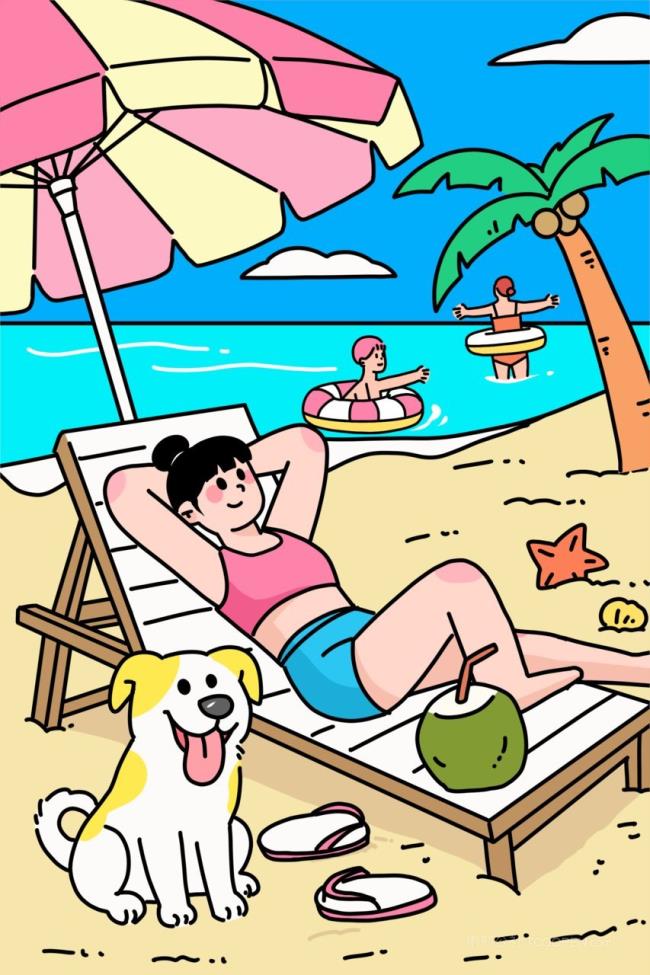 扁平风夏天海边沙滩女孩和狗躺平晒太阳插画