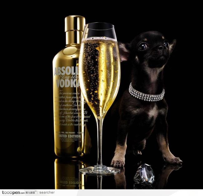 绝对伏特加酒创意画面--金色的酒瓶酒杯和宠物狗