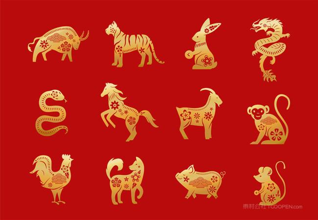 金色质感十二生肖鼠牛虎兔龙蛇马羊猴鸡狗猪剪纸